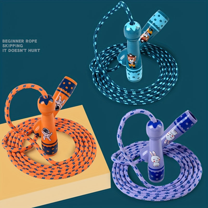 This kids’ jump rope is made with ABS plastic handles and a braided rope. It features cartoon patterns on the handles and an adjustable rope length to fit different heights.